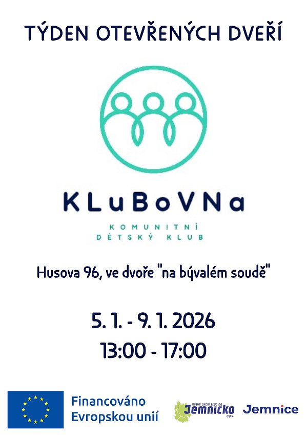 5. Srdečně zveme rodiče a děti, prarodiče a širokou veřejnost na TÝDEN OTEVŘENÝCH DVEŘÍ komunitního dětského klubu KLuBoVNa 5. až 9. ledna 2026 ve dvoře bývalého soudu, nám. Svobody 96 (budova ZUŠ a Optiky). KLuBoVNa je pro děti ve věku 11-15 let. KLuBoVNa je ZDARMA. Otevřeno po-pá, 13-17 hod. Těšíme se na Vaši návštěvu. Mas Jemnicko, o.p.s.