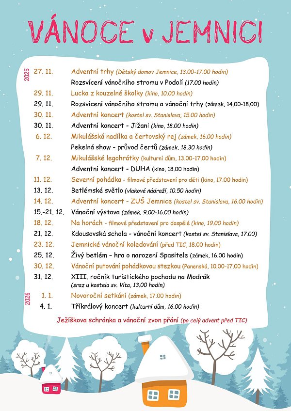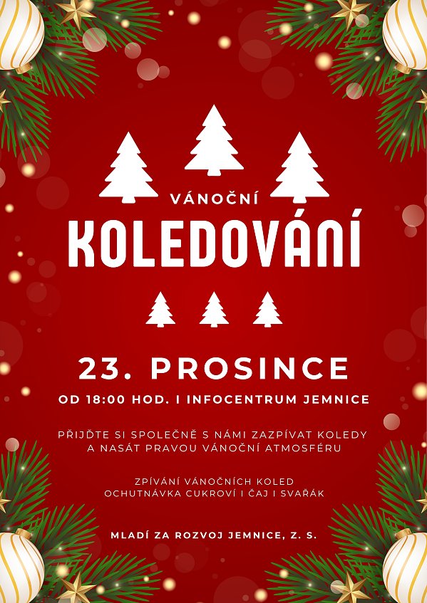 4. Mladí za rozvoj Jemnice si Vás dovolují pozvat na Vánoční koledování, které se uskuteční v úterý 23. 12. 2025 od 18:00 hod. před Turistickým informačním centrem Jemnice. Přijďte si společně s námi zazpívat vánoční koledy, zahřát se u svařáku nebo čaje a ochutnat domácí cukroví. Po dobu konání akce bude na místě k dispozici také pokladnička v rámci veřejné sbírky na pomoc Tadeáškovi Krivenskému, kterou organizuje Skautské středisko Jemnice ve spolupráci s městem Jemnice. Těšíme se na společné předvánoční setkání.