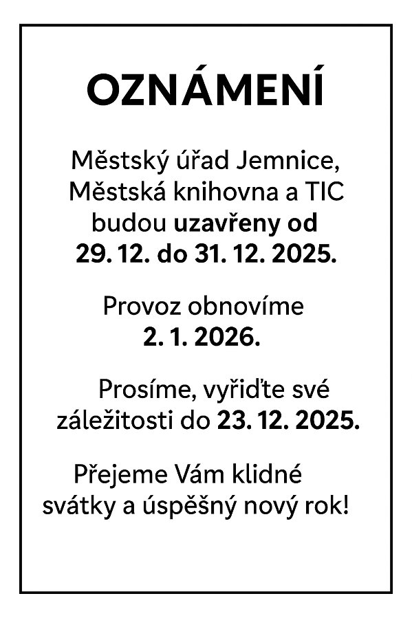 1. Vážení občané, v době od 29. 12. do 31. 12. 2025 budou Městský úřad Jemnice, Městská knihovna Jemnice a Turistické informační centrum Jemnice pro veřejnost uzavřeny. Prosíme, abyste své záležitosti vyřídili do 23. 12. 2025. Provoz bude opět zahájen v pátek 2. 1. 2026. Přejeme Vám klidné svátky a úspěšný nový rok.