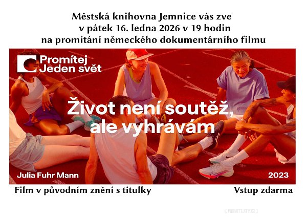 1. Městská knihovna v Jemnici vás zve v pátek 16. ledna 2026 v 19 hodin na promítání německého dokumentárního filmu Život není soutěž, ale vyhrávám. Vstup je zdarma.