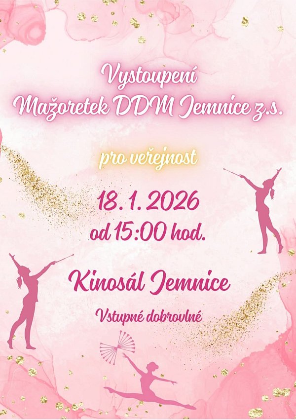 2. Mažoretky DDM Jemnice z. s. vás zvou na veřejné vystoupení, které je odrazovým můstkem do soutěžní sezóny. Vystoupení proběhne v neděli 18. ledna od 15:00 hodin v kinosále v Jemnici. Vstupné je dobrovolné. Čekají vás nové choreografie, energie, emoce, souhra pohybu a hudby – zkrátka vystoupení, které ukáže, na čem se poslední měsíce pracovalo.